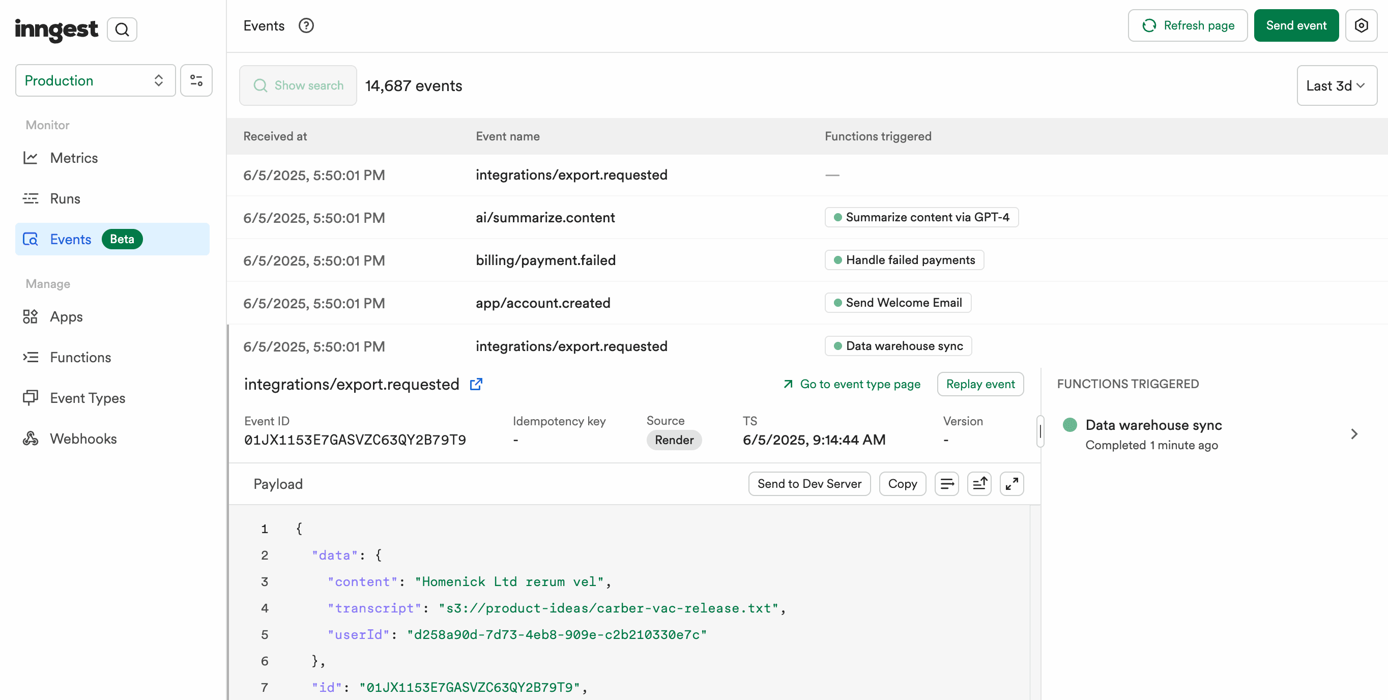We've added a new event history explorer to the Inngest dashboard. This view allows you to view all events across an entire environment. A filtered view is also available when viewing a specific event type.